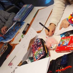 Nogen gange kræver det ikke mere end to passionerede fagpersoner og en ide, og så har man et flyvefærdigt projekt, med bibliotekets kerne-DNA som omdrejningspunktet. Idéen blev omsat til et forløb hvor 2.Y skrev og illustrerede deres egne bøger. De skrev på skolen og den kreative proces med at lave illustrationerne til bøgerne foregik i børnebiblioteket. Det blev til fire dage med workshop, hvor børnebiblioteket summede af koncentreret liv mens eleverne fordybede sig kreativt.