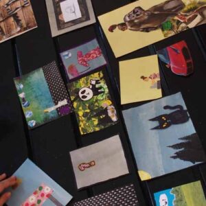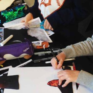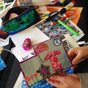Blågårdens Bibliotek og skolen. Workshop hvor børns egne fortællinger bliver til bøger illustreret i mixed media/collage.